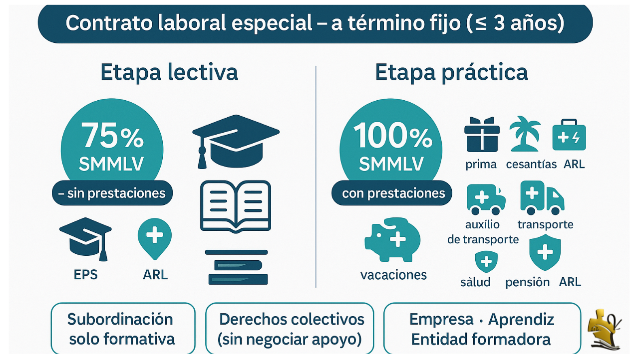 La ley explícitamente establece que “el contrato de aprendizaje es un contrato laboral especial y a término fijo”. Esto quiere decir que se reconoce como una modalidad de contrato de trabajo, aunque con características particulares por su finalidad formativa. Se integra así al régimen del Código Sustantivo del Trabajo, a diferencia del pasado cuando se regía por normas especiales al margen del contrato laboral ordinario.
